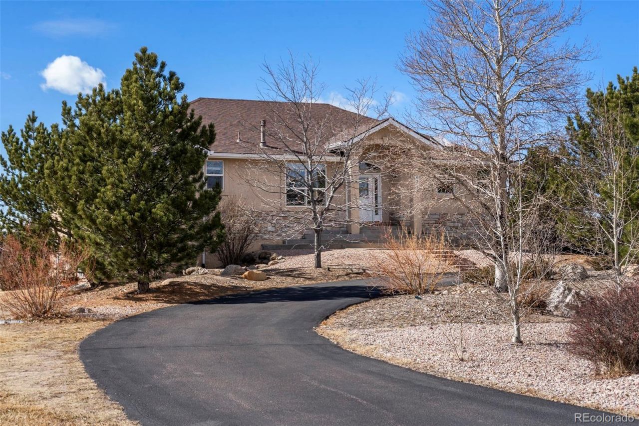Awaken every morning to a stunning view of Pikes Peak and the Front Range. This 4,400 sq ft raised ranch offers the wonderful balance of one-level living with a large lower-level walkout, including a rec room with a bar and two additional bedrooms. As you enter this home, enjoy vaulted ceilings throughout the entire main level. The great room and dining open to a spacious deck overlooking the 2.5-acre property. Back inside, the main level includes an open kitchen with double ovens, a gas stove, a center island, and an eat-in area. The spacious primary bedroom opens onto the back deck and includes a fireplace and a walk-in closet. The main-level guest suite may also function as an in-home office. Dont miss this opportunity to own a piece of open country living while just minutes away from ample shopping and recreation amenities.